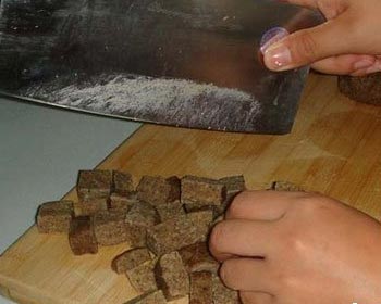 1、把馒头按狗狗的嘴大小切成适量的块状或条状,去皮!(中型犬可以整个馒头去皮,小型犬可以切片切条,大型犬可以自己蒸个型号超大的馒头);